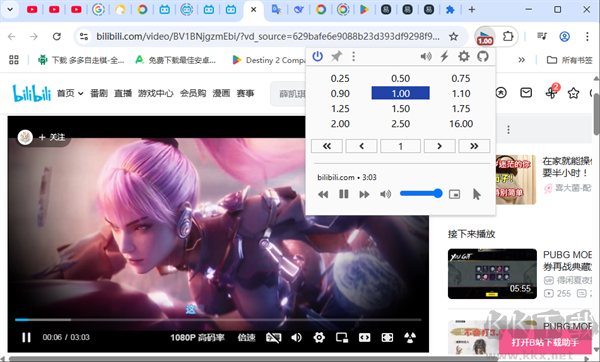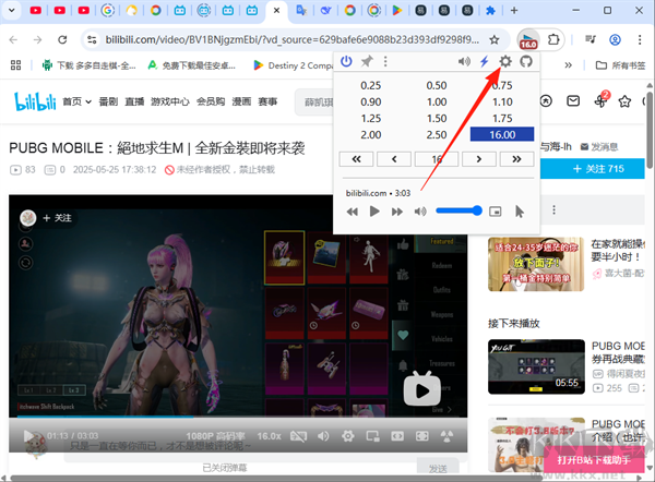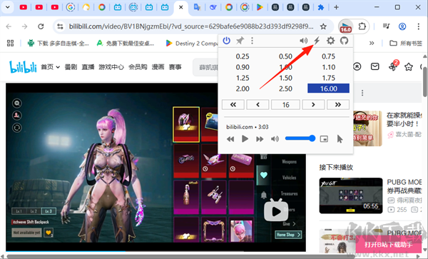 點擊插件圖標,即可看到0.25倍至16倍的速度選單,點擊所需速率,當前視頻的播放速度就會立即切換。