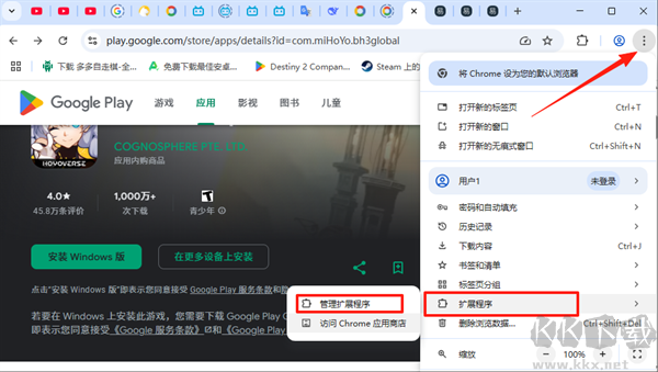 2、以谷歌瀏覽器為例,點擊右上角菜單,選擇“擴展程序”→“管理擴展程序”;