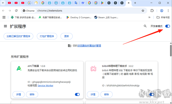 3、開啟右上角“開發(fā)者模式”(必須開啟,否則無法安裝);