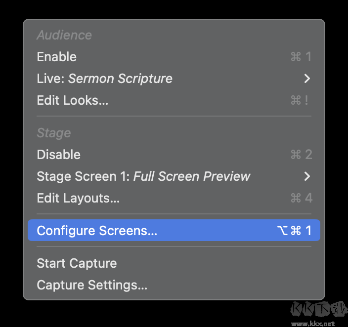 在 ProPresenter 中配置顯示輸出,可點(diǎn)擊菜單欄“屏幕”項(xiàng),再選擇“配置屏幕”進(jìn)行調(diào)整。Mac 用戶也可使用快捷鍵 Option-Command-1 進(jìn)入該設(shè)置界面。