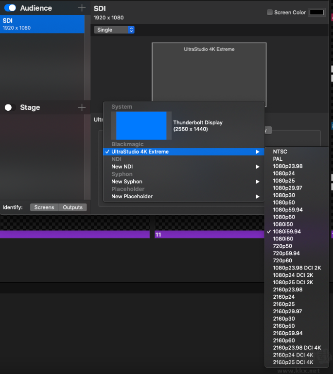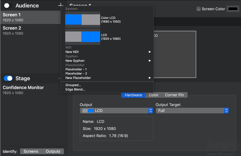 點(diǎn)擊任一類屏幕旁的“+”按鈕,即可查看可用的輸出類型,包括系統(tǒng)已連接的物理輸出、NDI 虛擬輸出、SDI 輸出(需連接相應(yīng)硬件)、Syphon 輸出(僅 Mac)及占位符選項(xiàng)。占位符適用于遠(yuǎn)程或離線預(yù)配置演示方案,幫助用戶提前適應(yīng)實(shí)際屏幕分辨率與布局。該窗口還支持設(shè)置屏幕分組、鏡像或邊緣融合。
