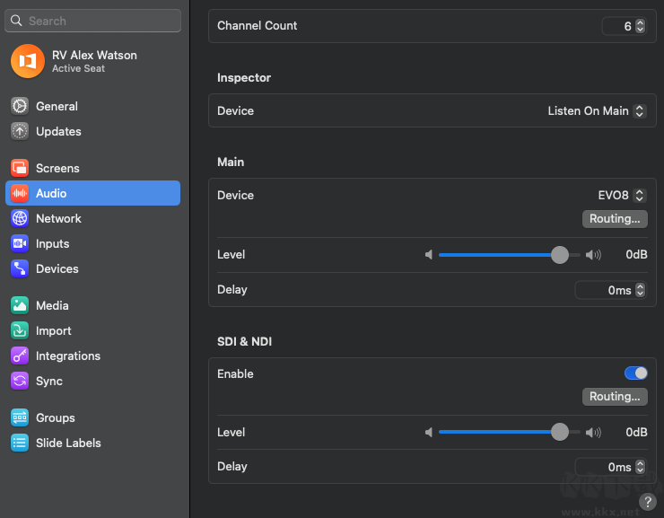 ProPresenter 的音頻輸出可在設(shè)置界面的“音頻”選項(xiàng)卡中調(diào)整。在此可配置可調(diào)通道數(shù)、媒體檢查器音頻輸出、主音頻輸出,以及 SDI 與 NDI 音頻輸出。所有輸出均可通過(guò)點(diǎn)擊路由按鈕自定義信號(hào)通路,并通過(guò)滑塊調(diào)節(jié)音量。
