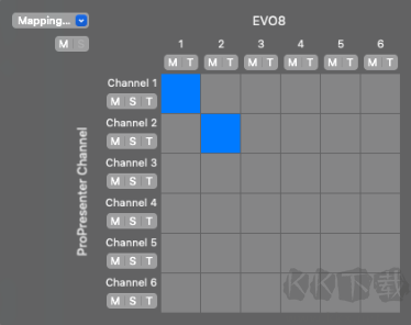 在此可將 ProPresenter 中的音頻通道路由至輸出設(shè)備的對(duì)應(yīng)通道。左側(cè)行代表音頻來(lái)源設(shè)備,上方列代表目標(biāo)輸出設(shè)備。所有音頻路由窗口均按此邏輯布局。