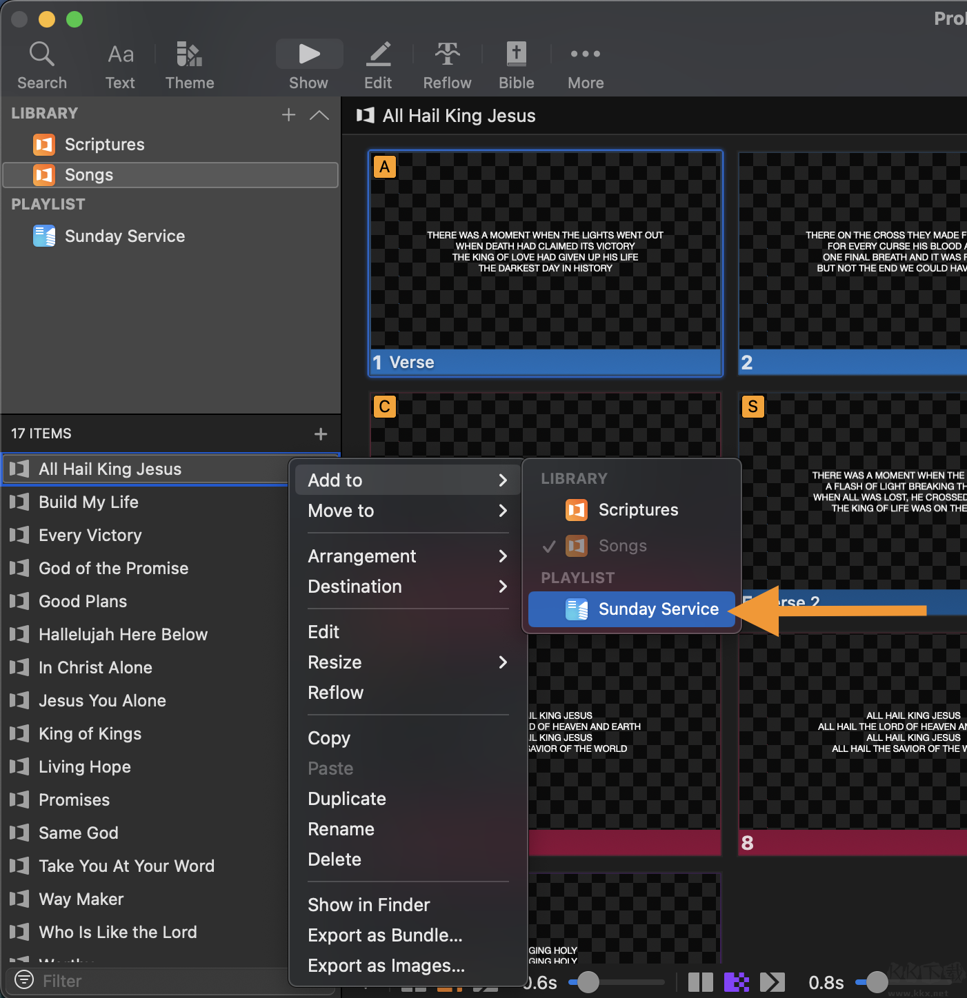 ProPresenter 支持建立多個(gè)素材庫(kù),并允許在同一播放列表中混合使用不同庫(kù)中的演示內(nèi)容。