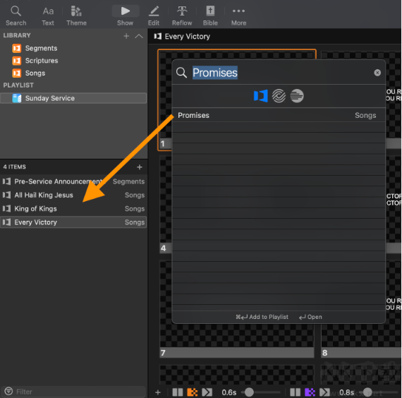 此外,還可通過(guò)搜索功能添加演示文稿:點(diǎn)擊左上角“搜索”圖標(biāo)或使用快捷鍵(Mac:Command + F,Windows:Control + F),輸入演示稿名稱。確保已選中“ProPresenter 庫(kù)”圖標(biāo),然后將搜索結(jié)果拖入播放列表中的指定位置。