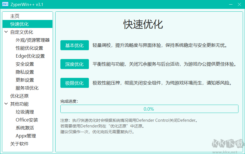 1、該工具為綠色版,無需安裝,啟動即可使用。主界面提供四大模塊:快速優(yōu)化、自定義優(yōu)化、優(yōu)化還原及其他功能。