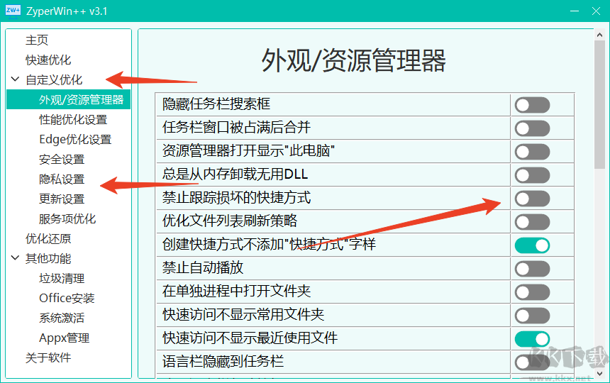 3、自定義優(yōu)化需用戶具備一定計算機知識,可在外觀、Edge瀏覽器等子模塊中勾選具體項目。不必擔心選錯,優(yōu)化還原模塊可單獨回退每一項設置。如有不確定,可全部還原后重新選擇。
