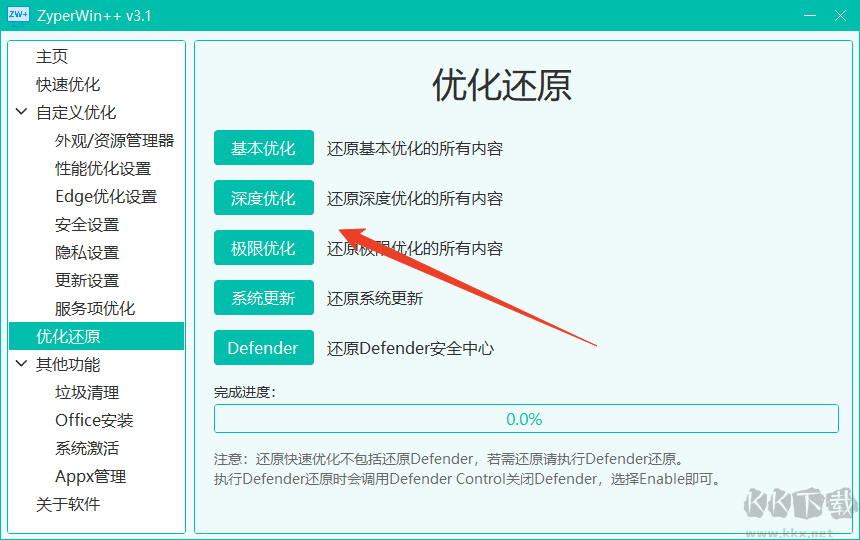 ZyperWin++是一款廣受歡迎的系統(tǒng)優(yōu)化工具,它可以給用戶提供快速優(yōu)化、自定義調整、操作回溯以及其他多種實用功能。不同于某些僅提供優(yōu)化而不負責后續(xù)問題的軟件,ZyperWin++還帶有優(yōu)化還原選項,畢竟不當優(yōu)化可能導致部分功能異常,如果使用其他軟件,用戶可能束手無策,而本工具可以一鍵撤銷優(yōu)化,將系統(tǒng)恢復至原本的狀態(tài)。