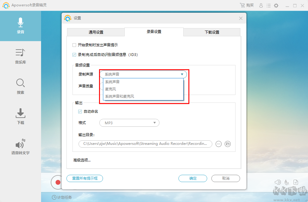 3、選擇“系統(tǒng)聲音和麥克風”:同步錄制電腦輸出和麥克風輸入的聲音。