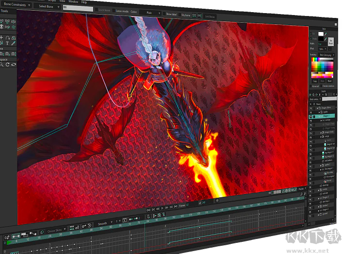 直觀且高效的綁定機制幫助用戶快速為角色與物體構建骨骼結構。綁定功能涵蓋正向與反向運動學、釘連骨骼、約束設置、自動拉伸壓縮效果,以及流暢的動畫遷移支持。