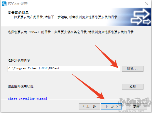 3、可點擊“瀏覽”更改安裝位置,查看磁盤情況后點擊“下一步”;