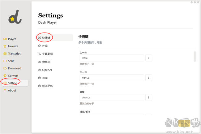 4、通過 “Setting” 進入設(shè)置界面,可自定義快捷鍵(上一句/下一句/重復(fù)/播放暫停等)