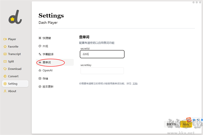 7、查詞功能需配置有道密鑰(可在官網(wǎng)申請)