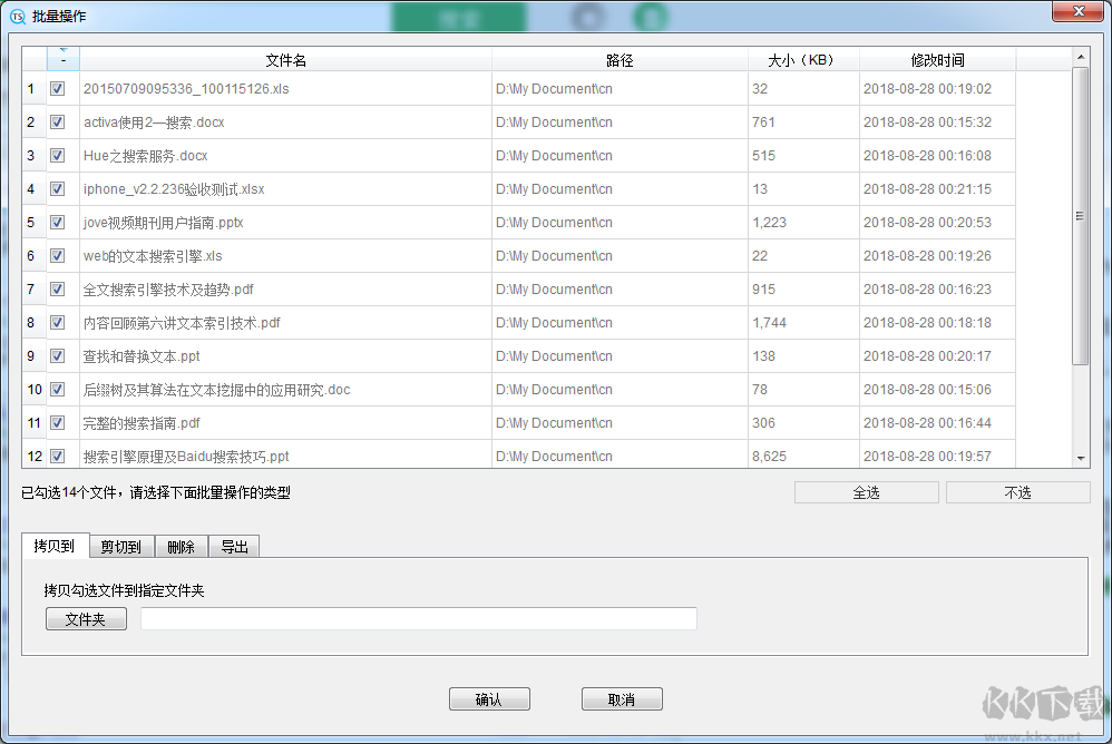 檢索完成后,若有結(jié)果,點(diǎn)擊“批量處理”可對全部符合條件的文件進(jìn)行操作。彈出窗口中用戶可將文件復(fù)制、剪切至指定目錄,也可執(zhí)行刪除或?qū)С鼋Y(jié)果信息。