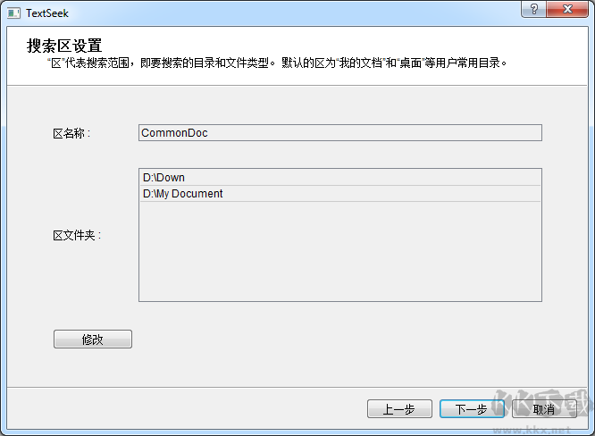 區(qū)域代表檢索范圍,包括待檢索文件夾與文件類型。TextSeek會自動設(shè)置默認(rèn)區(qū)域。如需調(diào)整,可點(diǎn)擊“編輯”。確認(rèn)區(qū)域后,點(diǎn)擊“下一步”。