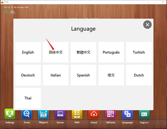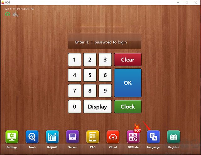 1、進入聚客餐飲管理系統(tǒng)后點擊右下角語言設置選項。