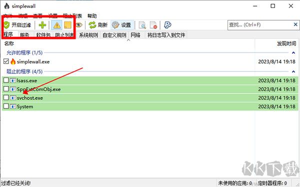 1、下載解壓后運行simplewall程序,第一次打開時默認是未啟用防火墻的(狀態(tài)欄的圖標是灰色),點一下下面的“未過濾“按鈕,啟用防火墻;