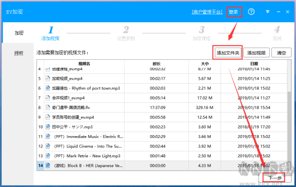 2.添加視頻。打開EV加密,登錄之前的注冊賬號,選擇【添加文件夾】導入所有視頻,稍后新錄制的單個視頻可以選擇【添加視頻】進行添加。