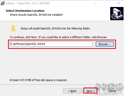 3、選擇安裝位置,例如放在E盤的E:\software\OpenSSL-Win64下,點(diǎn)擊next下一步