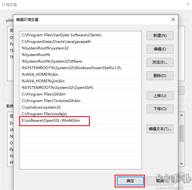 以上全部安裝完畢,要想通過windows控制臺(tái)使用OpenSSL工具生產(chǎn)密鑰,需配置環(huán)境變量,進(jìn)入系統(tǒng)屬性將安裝目錄添加到環(huán)境變量的path中即可。