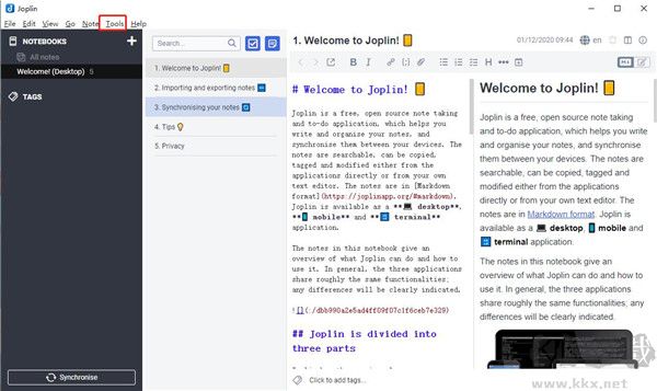 1、Joplin 中文版是一款免費(fèi)的開源筆記和待辦事項(xiàng)工具,它能夠處理大量筆記并將這些筆記整理成筆記本。