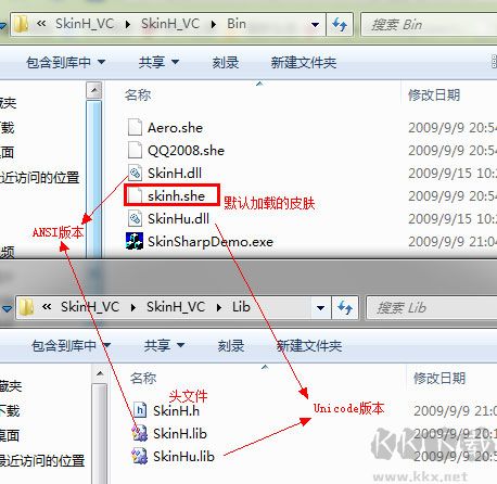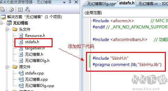 2、將換膚庫頭文件和鏈接庫文件(SkinH.h , SkinHu.lib )拷貝到工程的目錄下;