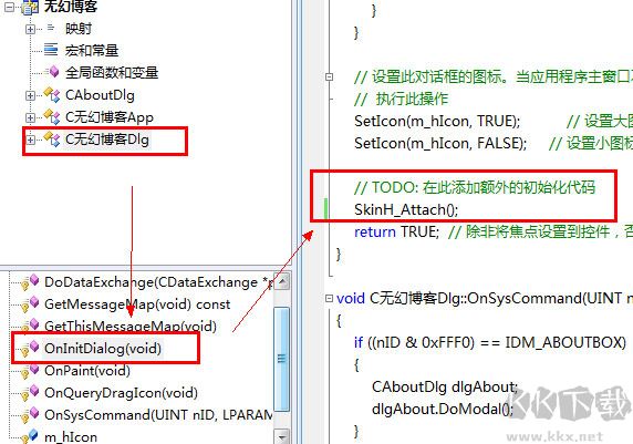 4、在工程的對話框初始化函數(shù)里面添加以下代碼,加載皮膚;