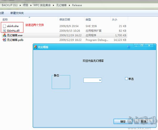 5、編譯下工程,產(chǎn)生Debug或Release文件夾,把DLL文件(SkinHu.dll )和皮膚文件(skinh.she )拷貝到此,效果如下。