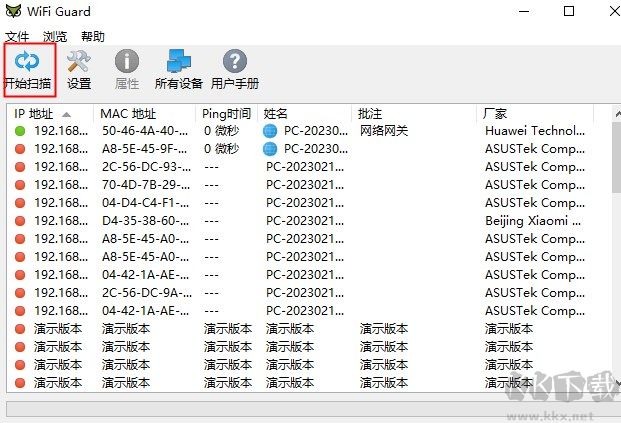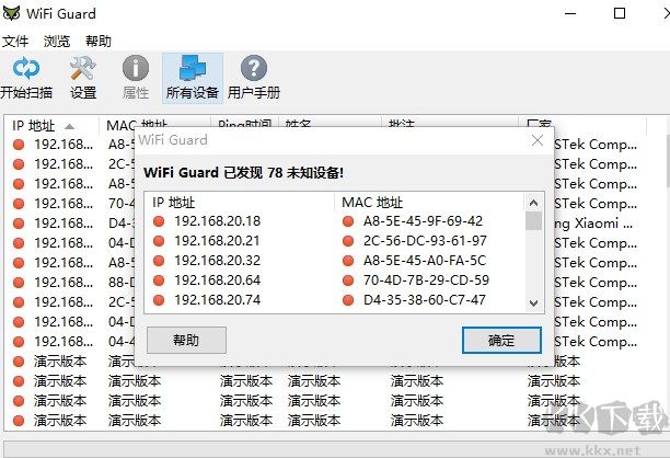 2、能夠探測(cè)局域網(wǎng)內(nèi)所有已連接的裝置,陌生設(shè)備以紅色標(biāo)識(shí)提示,已知設(shè)備則以綠色標(biāo)識(shí)顯示。
