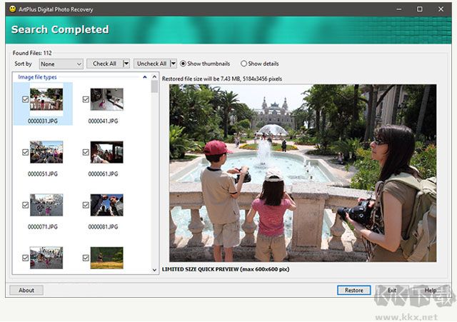 ArtPlus Digital Photo Recovery(照片恢復(fù)軟件)是一款功能強(qiáng)勁的照片數(shù)據(jù)恢復(fù)軟件,能幫用戶從數(shù)碼相機(jī)中快速找回已刪除的圖像。它支持所有主流圖像、視頻及音頻格式,還能恢復(fù)損壞的數(shù)碼相機(jī)和手機(jī)內(nèi)存卡中的文件,可以讀取目前市面上所有類型的存儲卡,即便遇到Windows無法識別的損壞存儲卡,也能借助它恢復(fù)珍貴數(shù)據(jù),能找回各類主流格式的照片、視頻與音頻文件?;謴?fù)方法很簡單:通過掃描存儲卡內(nèi)所有文件展示給用戶,只需要選擇需要恢復(fù)的文件就可以了。還支持JPG、TIF、DNG、Canon CR2、Konica-Minolta等豐富格式。需要的朋友快來下載試試吧!