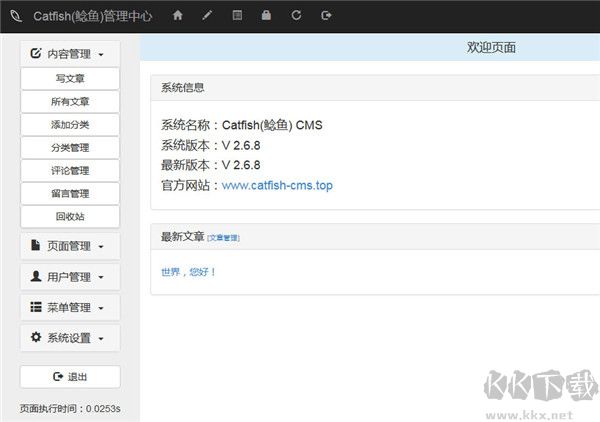 右邊是歡迎界面顯示了系統(tǒng)信息和最新文章等內(nèi)容。