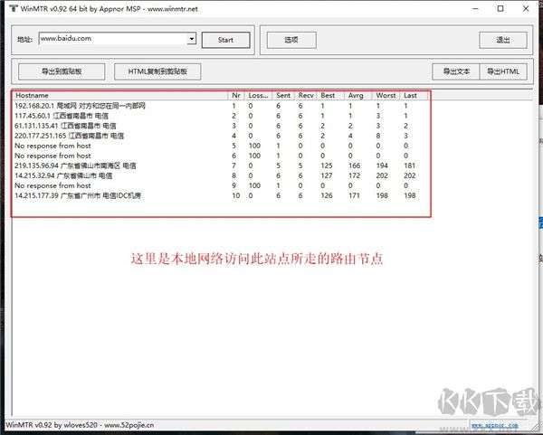 WinMTR(可視化路由跟蹤工具)是一款可視化路由跟蹤工具,擁有tracert與ping兩個(gè)命令的圖形界面,用它能直觀看到各個(gè)節(jié)點(diǎn)的響應(yīng)時(shí)間和丟包率,適合在Windows系統(tǒng)中進(jìn)行路由追蹤和Ping測(cè)試。軟件的使用方法很簡(jiǎn)單,只需要輸入要訪問的域名或服務(wù)IP,就能查看本地網(wǎng)絡(luò)訪問該站點(diǎn)所走的路由節(jié)點(diǎn)。測(cè)試報(bào)告可以導(dǎo)出為純文本或HTML格式方便后續(xù)查看,也能復(fù)制到剪貼板中,隨時(shí)查閱。需要的朋友快來下載試試吧!