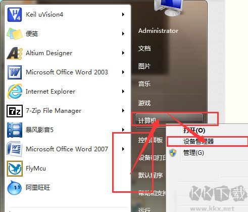 2、檢查: 找到電腦的”設(shè)備管理器“: 打開開始菜單,找到“計算機(jī)”;