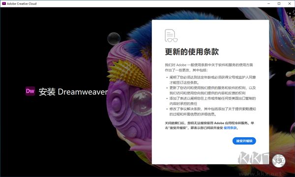 1、打開(kāi)軟件開(kāi)始安裝Dreamweaver,點(diǎn)擊接受并繼續(xù);