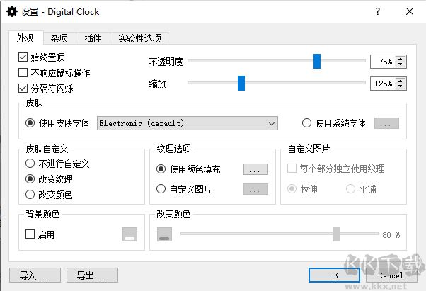 2、你還能對文字的字體、字體樣式和大小進行調(diào)整,挑選各類顏色或者從電腦里上傳圖像(格式包括 BMP、JPG、PNG、TIFF、XBM、XPM)來修改時鐘的紋理,并且可以選擇平鋪或者拉伸的模式。