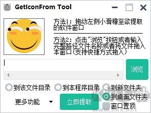 GetIconFrom Tool(圖標(biāo)提取工具)是一款功能強(qiáng)勁實(shí)用的圖標(biāo)提取工具,操作十分簡單。它能從exe/dll文件中快速提取圖標(biāo),支持三種提取方式:拖動(dòng)選取工具選擇、拖動(dòng)文件到窗口、從內(nèi)置資源瀏覽器中選擇,可以直接拖動(dòng)快捷方式到窗口提取。一鍵批量提取PC設(shè)備上全部應(yīng)用程序的圖標(biāo),格式為ico,提取后能導(dǎo)入目標(biāo)文件夾。支持程序拖拽操作,只需要拖拽exe文件就能提取圖標(biāo)信息。軟件提供多種圖標(biāo)提取功能,包括提取系統(tǒng)圖標(biāo)、提取計(jì)算機(jī)內(nèi)所有圖標(biāo)等,可以快速獲取高清程序圖標(biāo),提取速度快、使用門檻低。需要的朋友快來下載試試吧!