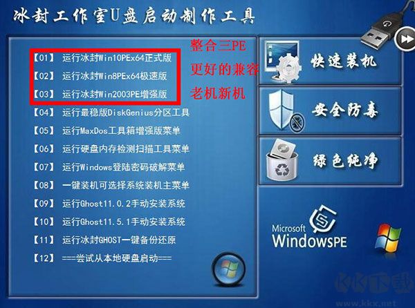 3、制作成功,冰封U盤啟動(dòng)工具整合三PE,更好的兼容老機(jī)新機(jī)