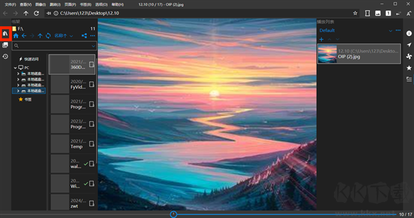 有趣的是當(dāng)我們打開一個(gè)文件夾,點(diǎn)擊頂部地址欄右邊的 “左右” 圖標(biāo),它底部的進(jìn)度條滑動快可以像書本一樣選擇 “左開” 或 “右開”,左右拖動進(jìn)度條或者鼠標(biāo)單擊和雙擊,分別對應(yīng)上一張圖片和下一張圖片,而頂部地址欄右邊的數(shù)字按鈕表示的是 1 頁面顯示和 2 頁面顯示,說白了就是 A4 紙和 A3 紙的區(qū)別。