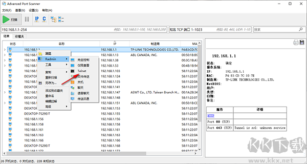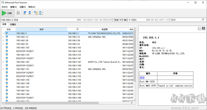 Advanced Port Scanner(端口掃描軟件)是一款免費(fèi)端口掃描軟件,可以幫助你快速找到網(wǎng)絡(luò)計(jì)算機(jī)上的開放端口,詳細(xì)的顯示對(duì)方電腦的狀態(tài)、名稱、IP地址、制造商、Mac地址及端口號(hào)等信息。還具備多種實(shí)用功能,支持遠(yuǎn)程關(guān)機(jī)、文件傳輸、電腦控制,也能打開CMD、發(fā)起聊天和語音通話??梢源蠓鶞p輕局域網(wǎng)管理員的工作量,非常實(shí)用的網(wǎng)絡(luò)端口查詢管理軟件。需要的朋友快來下載試試吧!