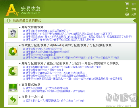 四種恢復模式(請仔細閱讀選項說明,選擇合適的掃描方式):