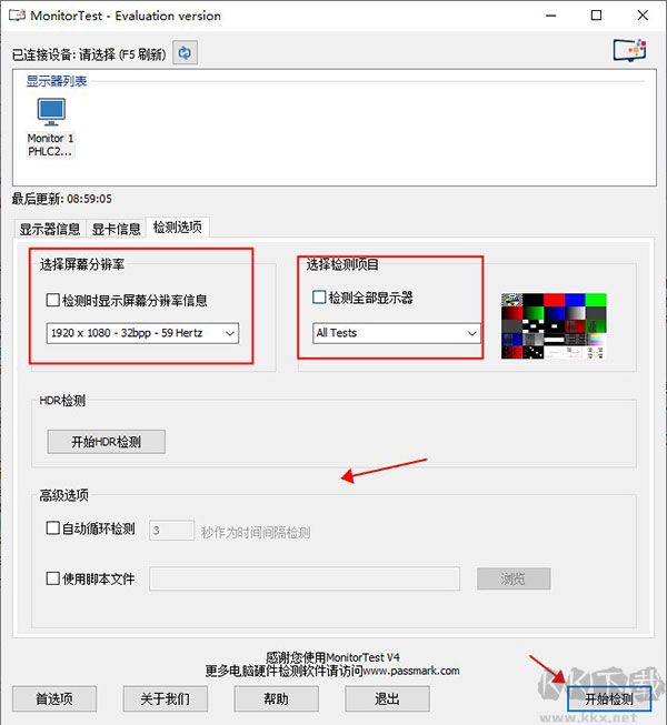 1、選擇要測試的顯示器,或選中“測試所有顯示器”復(fù)選框以一次測試所有顯示器(“測試所有顯示器”僅在注冊版本中可用)。