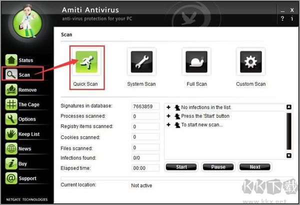 打開Amiti Antivirus軟件點擊軟主界面左邊功能欄中的Scan掃描,打開掃描功能窗口。我們可以選擇快速掃描、系統(tǒng)掃描、完全掃描和自定義掃描。點擊快掃描,開始掃描電腦病毒;