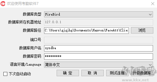 3、打開漢王考勤管理系統(tǒng)服務(wù)端(部分系統(tǒng)會顯示安裝一個(gè)插件進(jìn)行安裝即可),點(diǎn)擊升級數(shù)據(jù)庫后再點(diǎn)擊測試連接后在點(diǎn)擊確定即可;