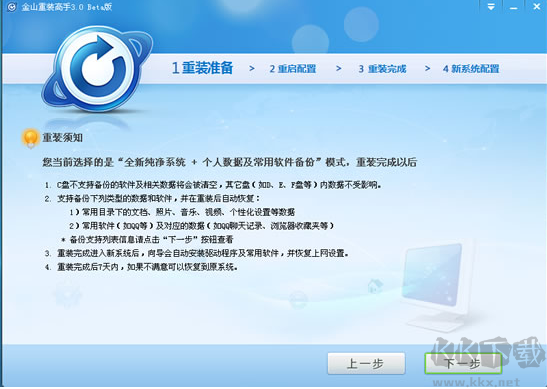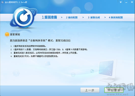 5、點擊"開始重裝"(重裝系統(tǒng)過程中,電腦會自動重啟3次,不要緊張哦!重啟完成后會自動進入您的桌面,電腦重啟后進入桌面,自動啟動金山重裝高手,進行數(shù)據(jù)還原(系統(tǒng)設置、驅動、可保留軟件和對應的數(shù)據(jù))。