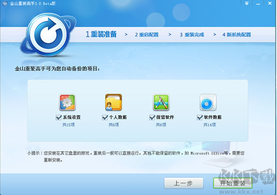 2、若希望獲得一個完全干凈的系統(tǒng)環(huán)境,不保留任何原有軟件、數(shù)據(jù)或設定,可在備份階段取消勾選【可保留的項目】,隨后點擊【開始一鍵重裝】即可實現(xiàn)。備注:因Office軟件結構特殊(不具備導入導出功能),現(xiàn)階段暫無法保留。