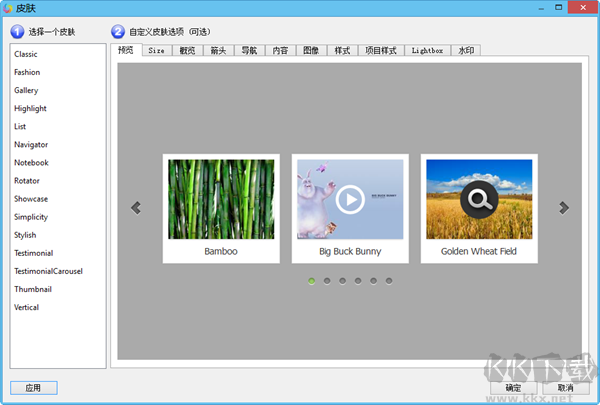 1、借助預設模板,用戶無需編寫CSS或JavaScript代碼,即可快速制作專業(yè)級的水平或垂直jQuery輪播組件;