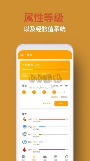 劃分為六大屬性,你可以指定任務所歸的屬性。比如持續(xù)完成鍛煉身體相關的任務,可以提高你的『力量』等級。