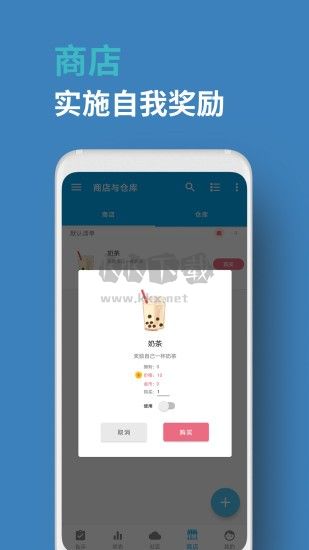 - 商店:管理個人商店,上架商品(自己想要的獎勵),設置價格(獎勵獲取的代價)。然后完成事項獲得金幣獎勵,前往商店購買商品(獲取獎勵),最后在倉庫中使用你的商品吧。
