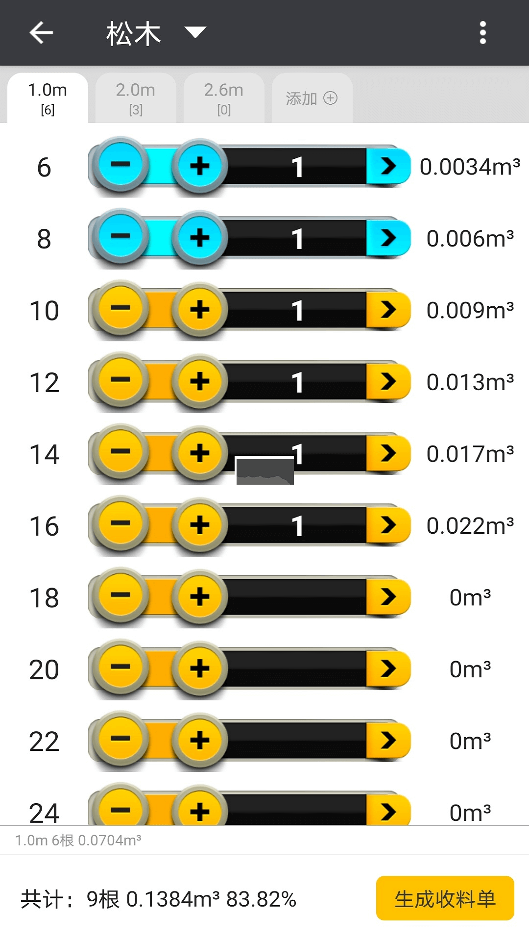 1、數(shù)量統(tǒng)計,用戶可自行增加或減少木材的數(shù)量,會自動為用戶進行統(tǒng)計;