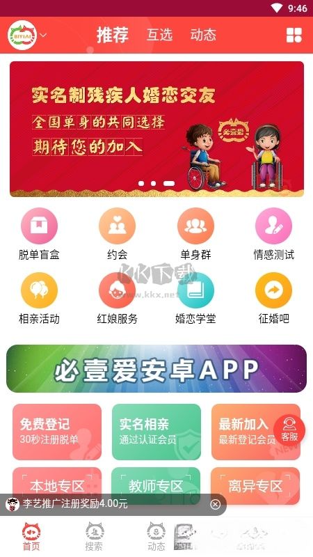 必壹愛(ài)APP是一款非常實(shí)用的專(zhuān)門(mén)為殘疾人士們打造的戀愛(ài)相親軟件,你可以在必壹愛(ài)APP精準(zhǔn)到找到和自己興趣愛(ài)好相同的人,必壹愛(ài)APP上面的大多數(shù)人也都是殘障人士,可以在必壹愛(ài)APP進(jìn)行便捷的溝通交流,找到屬于你的靈魂伴侶,感興趣的用戶快來(lái)KK下載體驗(yàn)吧~